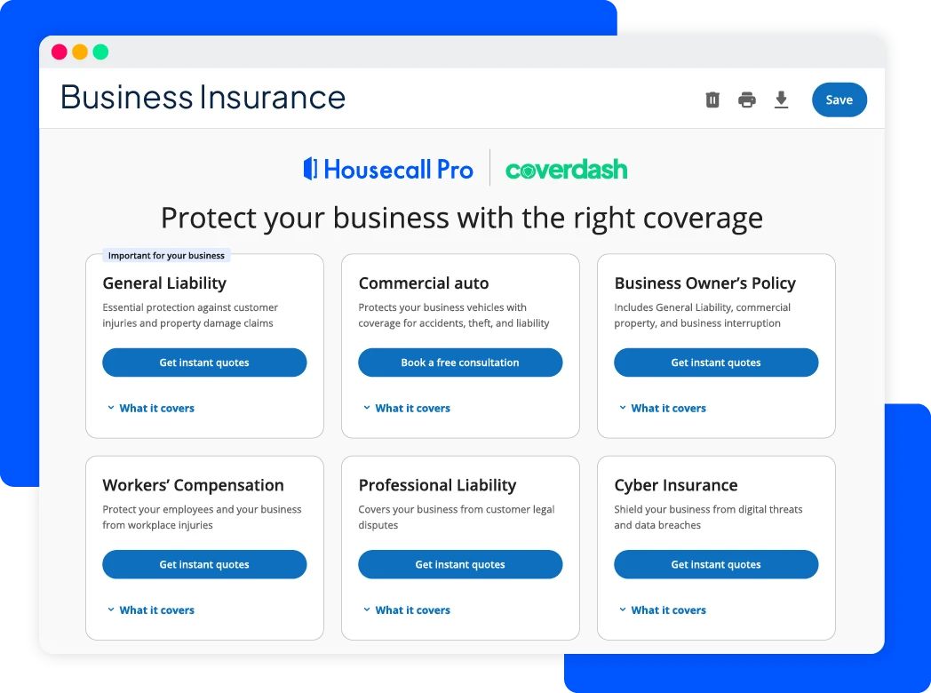 Explore business insurance options and manage your coverage—all in Housecall Pro.