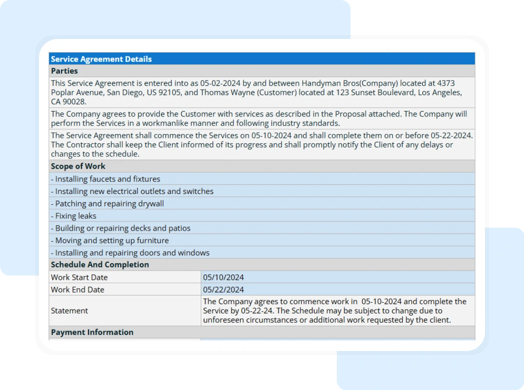 In this template, the agreement identifies the “Parties”—Handyman Bros (Company) and Thomas Wayne (Customer). It captures essential details like Work Start/End Dates and a specific Scope of Work, such as patching drywall or fixing leaks. Beyond the labor, it establishes rules for project management, including Terms and Conditions for termination and governing laws, transforming a casual service call into a structured, professional engagement.