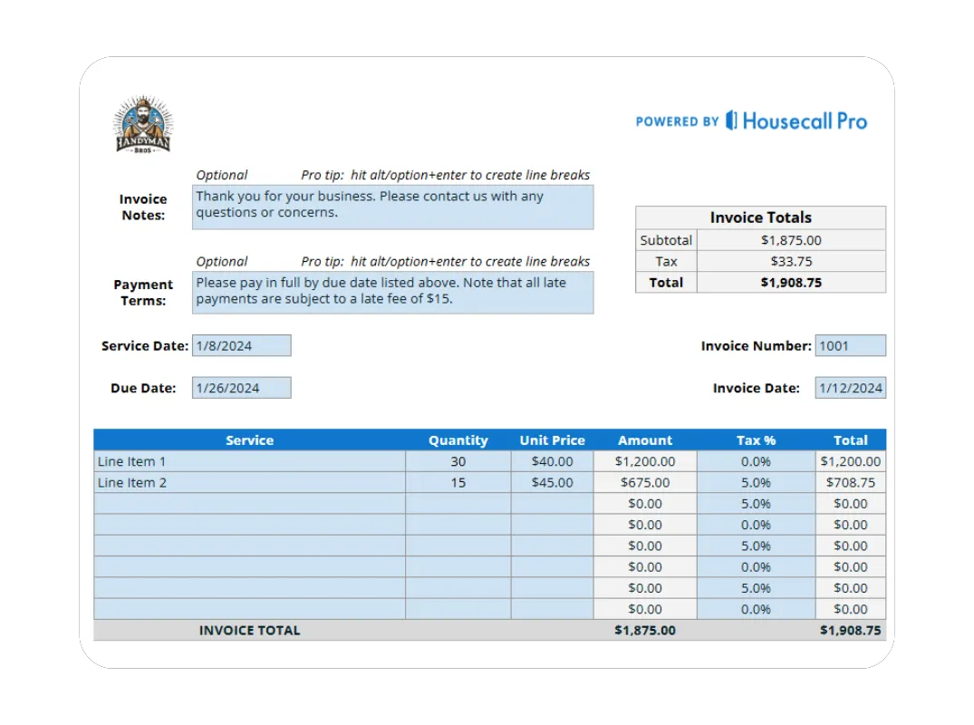 - Notes and Terms: Use the Invoice Notes and Payment Terms sections to thank the customer and specify how you accept payment (e.g., “Checks payable to…”).