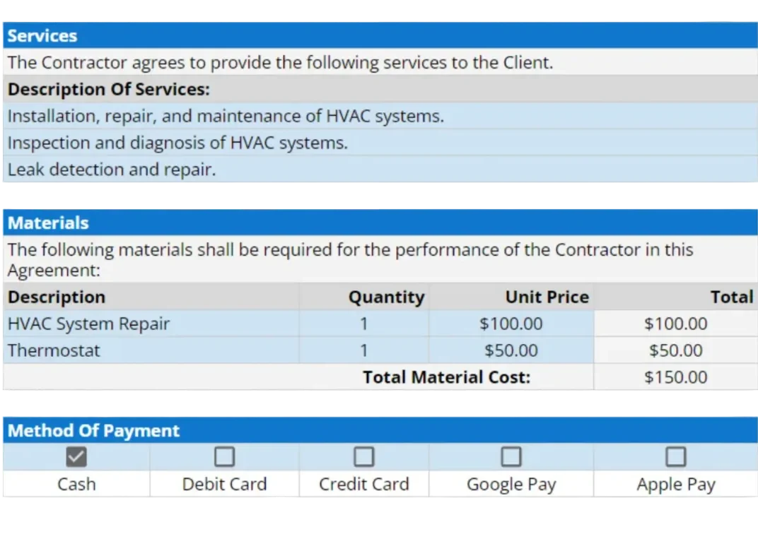 Creating accurate and thorough contracts is essential for any HVAC company. Having a simple, straightforward contract template makes it a whole lot easier. Our contract template features: