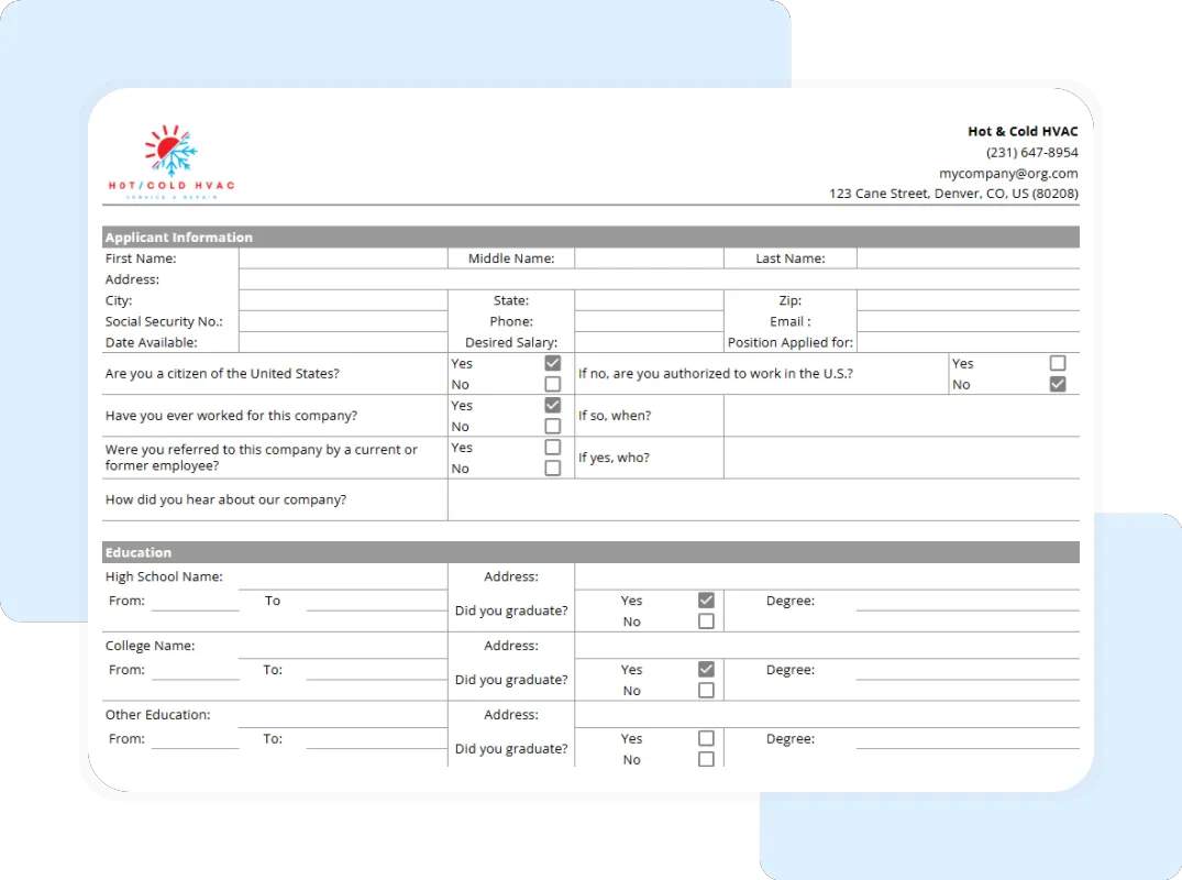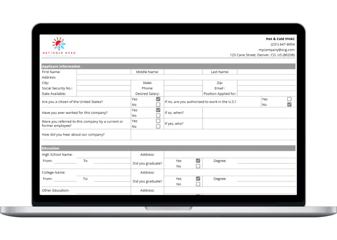 Creating accurate and thorough applications is essential for any HVAC company. Having a simple, straightforward employment application template makes it a whole lot easier.