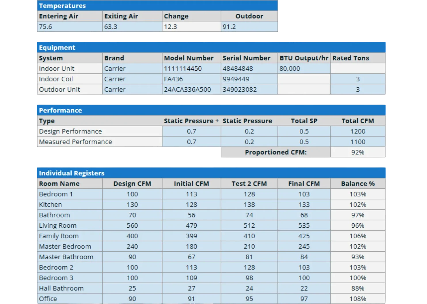 Creating accurate and thorough test and balance reports is essential for any HVAC company. Having a simple, straightforward test & balance report template makes it a whole lot easier. Our test and balance template features: