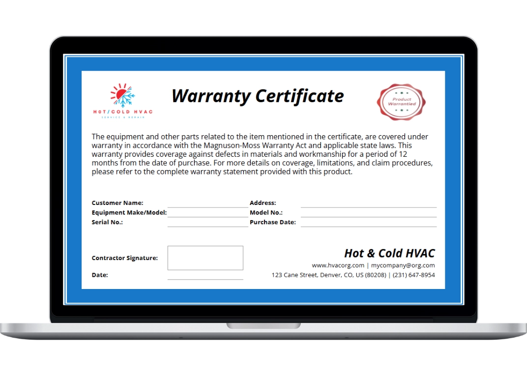 A warranty certificate is a formal document that outlines the terms and coverage of a product or service warranty. In the HVAC industry, warranty certificates are essential for: