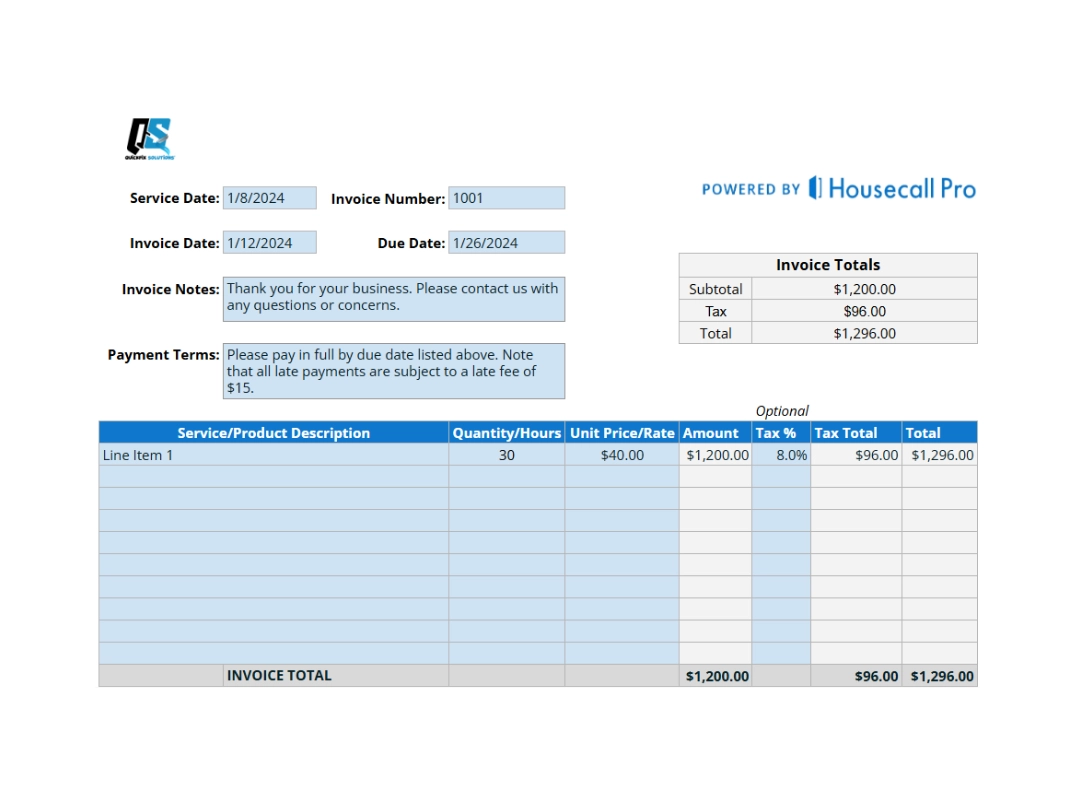 A small business invoice template typically includes your business name and contact info, client details, invoice number, date, itemized services or products, total amount due, and payment terms.